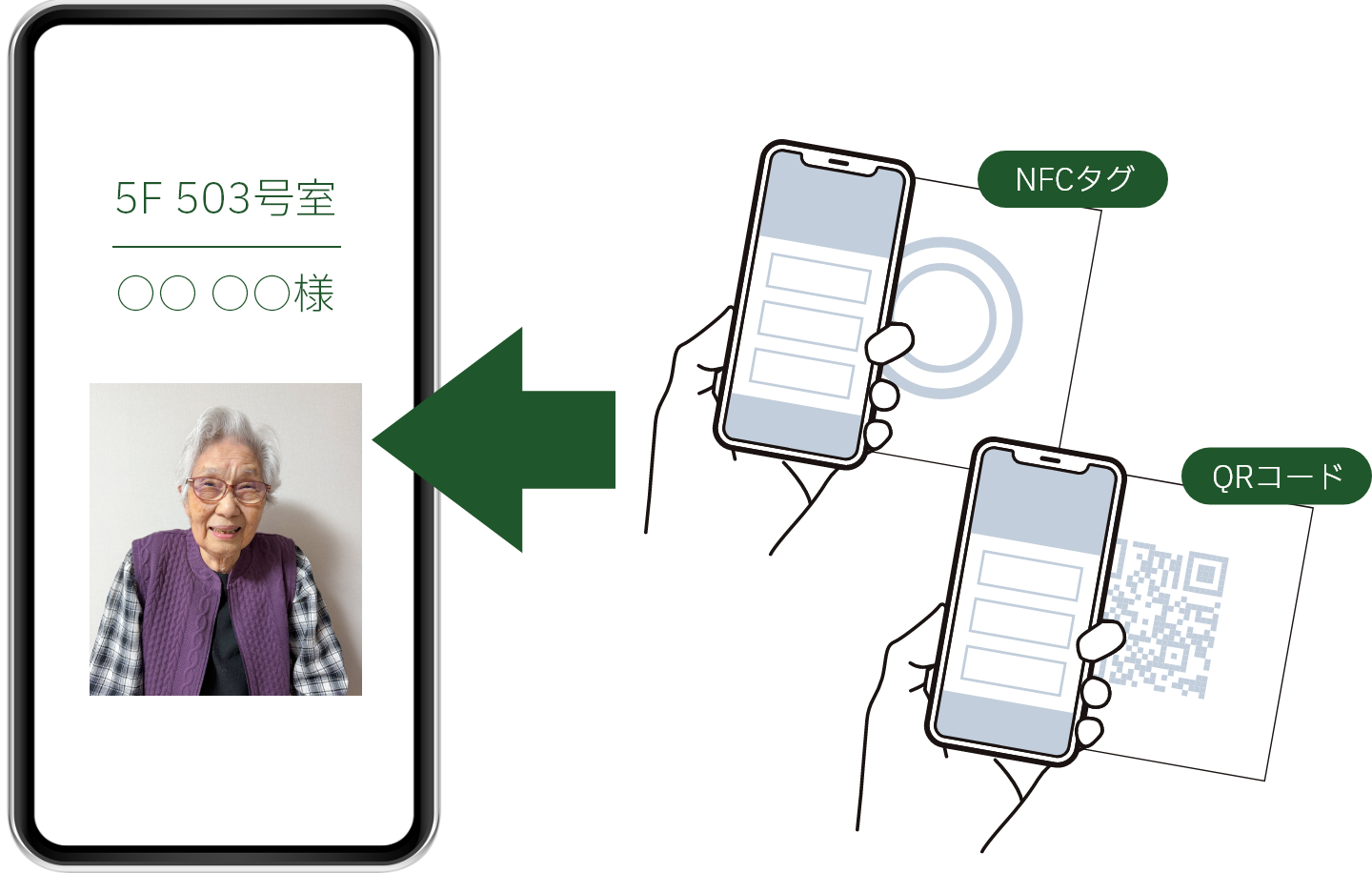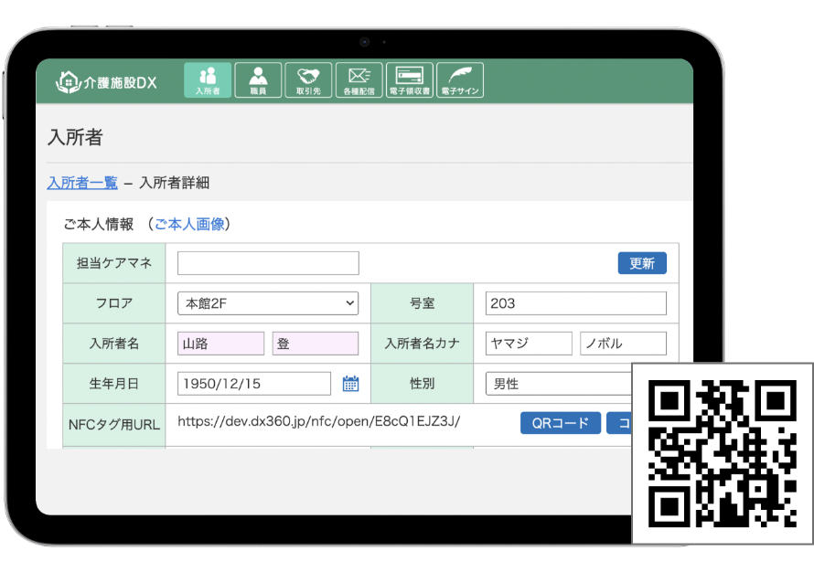 入所者ごとに発行するURLでNFCタグやQRコードを作成する事で、